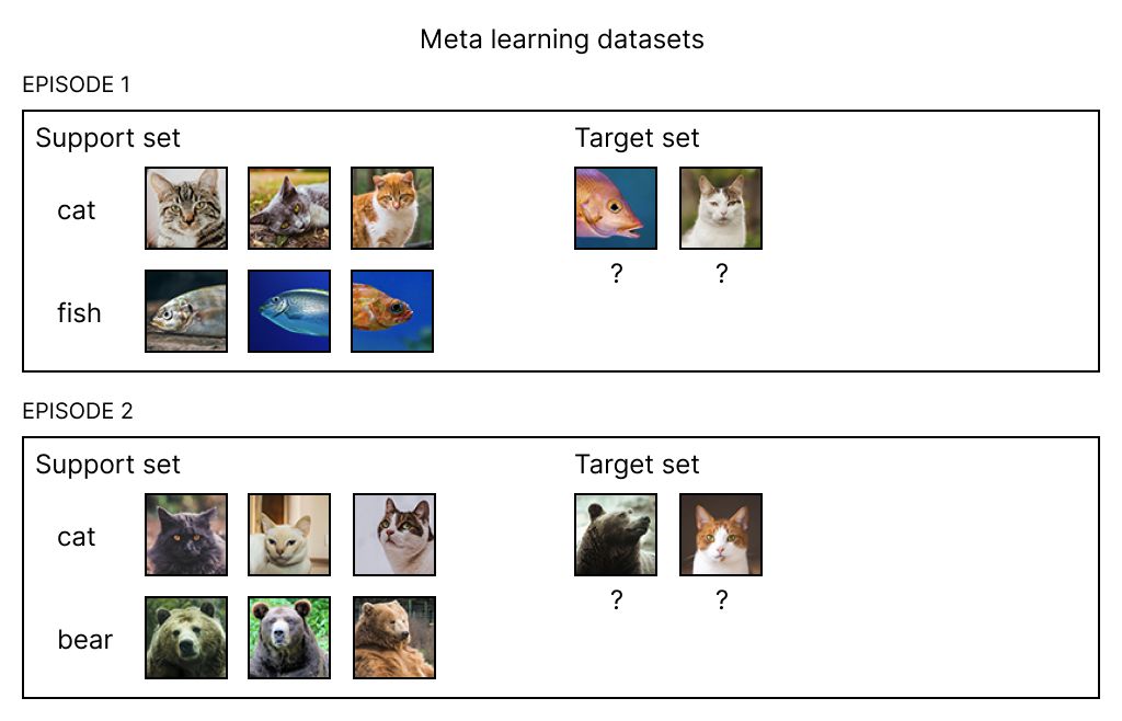 在我们的例子中,我们使用了四个分类(猫、熊、鱼和鸟)并定义了一个在每一类只提供三个样本的情况下,做二分类的情况。这提供了 6 个(从 4 个样本中选择 2 个)不同的任务,而且这些显然是不够的。因此,在元学习中,尽管我们不需要很多猫的样本,我们确实需要很多不同种类动物的样本。进一步的,在推断中,也需要构建支持集合和目标集合,这是一种不同的数据需求(或限制)。
