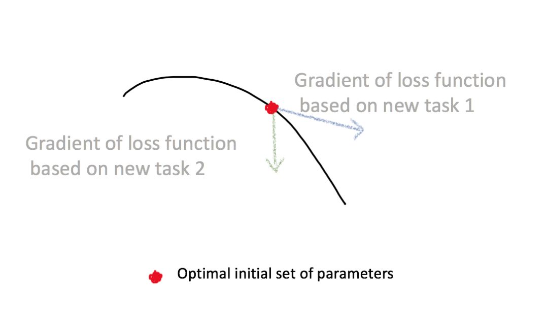 但是这种神奇的内部表示从何而来?在迁移学习中,这种表示是预训练神经网络在大量数据中训练得到。初始化后,新的小数据集会重新训练神经网络,既可以是整体的,可能是局部的(只有最后一层)。获得这种表示的另一种方法是采用一组初始的神经网络参数(参考链接:https://arxiv.org/abs/1703.03400)。当这个网络由正确的参数进行初始化,它就可以快而简单地使用少量新数据进行调整。这说明,初始的一组神经网络参数可能对新任务非常敏感,小的参数变化会极大提高损失函数在任何任务上的表现。