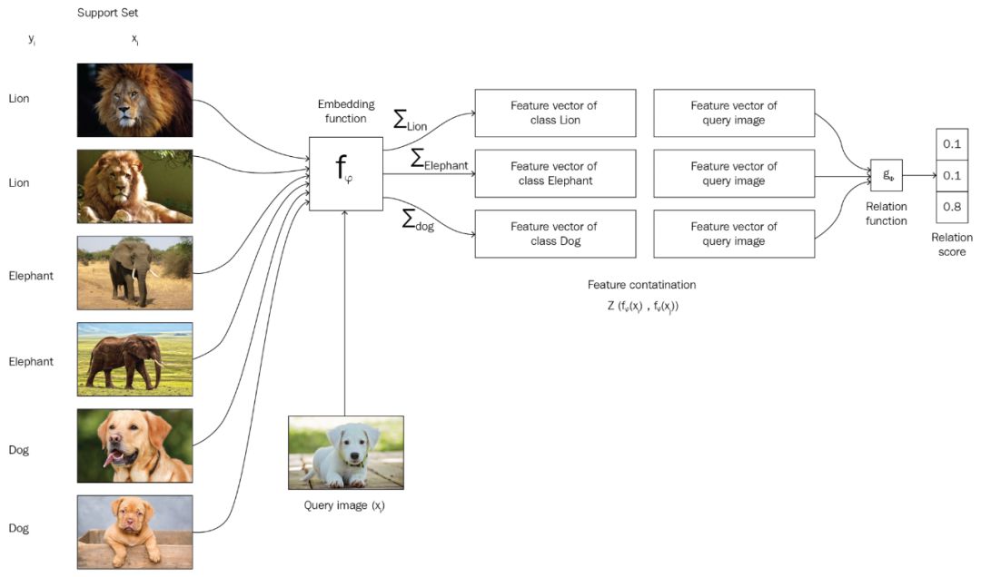 图 3:匹配网络的工作原理。支持集合中有狮子、大象和狗三类,而待分类的图片类别未知。通过嵌入函数将每一个类别(狮子、大象、狗和未知图片)转换为嵌入向量,并使用关系函数(如 Softmax)计算已知分类和未知分类的相似度。图片来自 Hands on Meta Learning with Python,chapter 4。