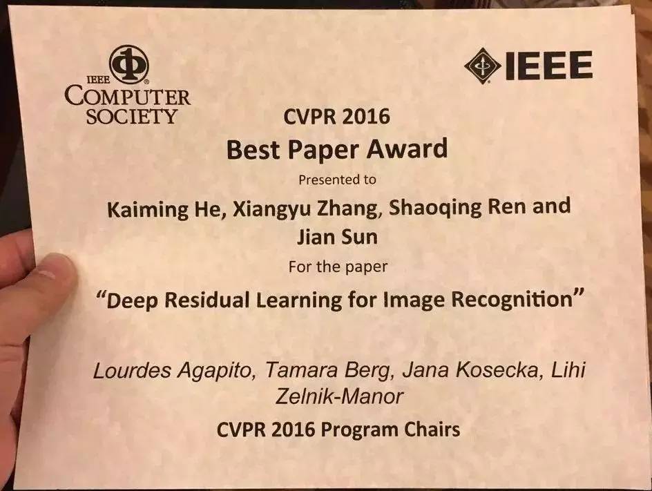 好友孙剑和他的同事们提出了ResNet,去年底横扫了各种Image Recognition和Segmentation Challenges。凭此工作,他也再次获得CVPR Best Paper Award。事后,他在朋友圈post:上次的奖状丢了,没办法,只好再拿一下。