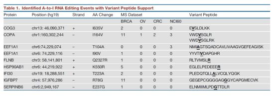 使用来自癌症基因组图谱(TCGA)的RNA测序(RNA-seq)数据,最近的研究已经在癌症转录组中检测到大量的A至I编辑的实现,其中许多有临床相关性。然而,人类癌症RNA编辑模式的研究到目前为止仅集中在RNA水平上。鉴于转录后调控的巨大复杂性,研究人员旨在解决由错义A到I编辑所产生的遗传信息被翻译成蛋白质序列的程度,从而有助于癌症蛋白质组学的多样性。最近从临床蛋白质组肿瘤分析联盟(CPTAC)获得的质谱(MS)数据提供了解决这个问题的机会,因为它们是从患者样品产生的具有来自TCGA的平行基因组和转录组数据的队列。