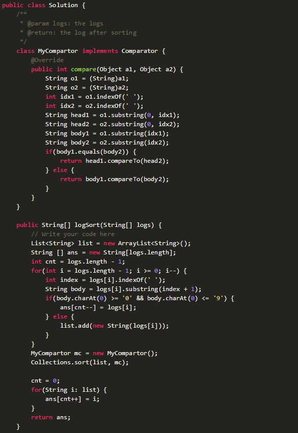 题目描述:给一个日志,由List< String >组成,每个元素代表一行日志。每行日志的信息用一个空格分开。最前面的是日志的ID,后面是日志的内容,内容要么是全部由字母和空格组成,要么是全部由数字和空格组成。现在将日志进行排序,要求字母内容按照内容字典序排序放在顶部,数字内容放到底部且按照输入顺序输出。(注意,空格也属于内容,并且当字母内容字典序相等时,按照日志ID字典序排序,保证ID都不重复)