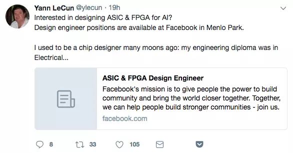 据了解,Facebook 想打造的 ASIC 和 FPGA,一个是专用集成电路,一个是半定制的现场可编程门阵列,都是除 GPU 之外的人工智能的重要硬件解决方案。此外,Facebook 的招聘中还有 Oculus SoC 处理器的开发工程师、Oculus 计算视觉团队的架构师,以及几个固件工程师的职位,以支持使用专用硬件加速器(HWA)开发先进的 SoC 计算视觉和机器学习。