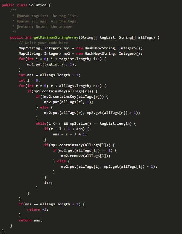 题目描述:给定一个字符串集合tag_list,一个字符串数组all_tags。请寻找最小的all_tags子数组包含tag_list中的所有字符串,输出这个子数组的长度。如果不存在返回-1。