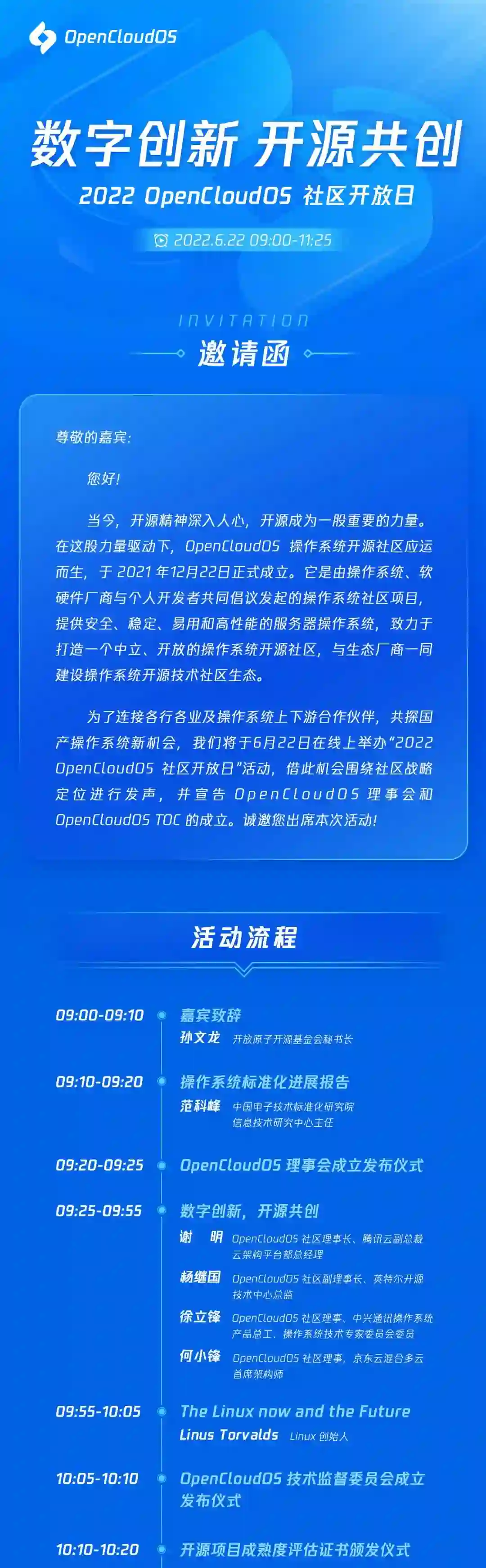 本次活动,开放原子开源基金会秘书长孙文龙、COPU 名誉主席陆首群、Linux 创始人 Linus Torvalds、中国电子技术标准化研究院信息技术研究中心主任范科峰将纷纷亮相,并且 OpenCloudOS 社区理事长、腾讯云副总裁、云架构平台部总经理谢明,OpenCloudOS 社区副理事长、英特尔开源技术中心总监杨继国,OpenCloudOS 社区理事、中兴通讯操作系统产品总工、操作系统技术专家委员会委员徐立锋和 OpenCloudOS 社区理事、京东云混合多云首席架构师何小锋也将出席活动。