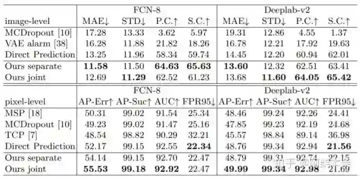 表1:在Cityscapes数据集上的实验。我们在FCN-8和Deeplab-v2的分割结果中进行失败检测。“Ours separate”和““Ours joint”意味着分别训练我们网络中的图像级和像素级故障检测头。