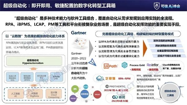 超级自动化已经成为企业即开即用、敏捷配置的数字化转型工具箱。经过一年多的发展,超级自动化有了很多新的价值。在概念深化方面,中国信息通信研究院在今年发布的《超级自动化技术与应用研究报告(2022)》中首次对其主要概念进行了深入剖析和理解,认为“超级自动化是多种技术能力与软件工具组合,覆盖了自动化从需求发现到应用实践的全流程”;在技术发展方面,机器人流程自动化、智能流程管理、低代码应用平台、流程挖掘等工具和平台,衔接起了企业级各类复杂业务场景,其综合应用、交互使能是超级自动化发挥效能的重要手段。