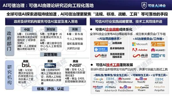 可信AI由理论研究迈向工程化落地。随着人工智能技术的快速发展,社会各界对可信AI研究已经从理论探索逐步走向工程化落地实践。政府与研究机构相关政策和规范从宏观指导,开始向可操作、可落地的规范演进。在法律监管层面,各政府部门的法规政策愈发重视实施和操作。例如新加坡于5月出台世界首个AI治理测试框架及工具包;英国6月宣布首个人工智能伦理和监管的重大研究计划。