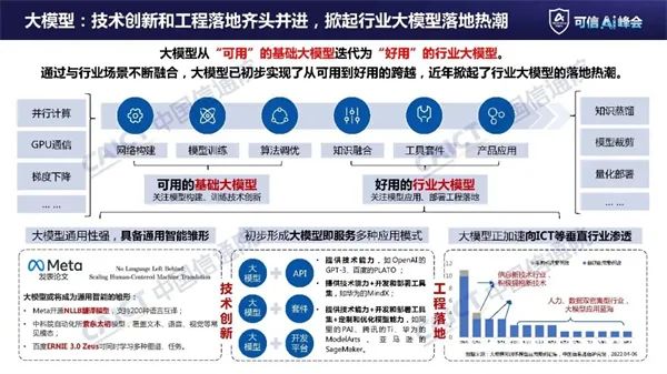 在工程落地方面,已初步形成大模型As a Service的应用模式,加速向互联网、ICT、金融、政务等垂直行业渗透。为支撑应用方更便捷地开发和部署大模型,多家头部企业发布了行业大模型及开发工具。