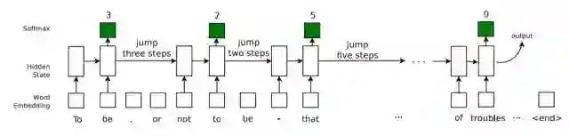具体说来,文章是希望在LSTM的基础上加入“跳转”功能,从而使得这个时序模型能够有能力判读是否要略过一部分文字信息。简单说来,作者们是这么对LSTM进行改进的。首先,有一个参数R来确定要读多少文字。然后模型从一个0到K的基于Multinomial分布的这一个跳转机制中决定当前需要往后跳多少文字(可以是0,也就是说不跳转)。这个是否跳转的这一个步骤所需要的Multinomial分布,则也要基于当期LSTM的隐参数信息(Hidden State)。跳转决定以后,根据这个跳转信息,模型会看一下是否已经达到最大的跳转限制N。如果没有则往后跳转。当所有的这些步骤都走完,达到一个序列(往往是一个句子)结尾的时候,最后的隐参数信息会用来对最终需要的目标(比如分类标签)进行预测。