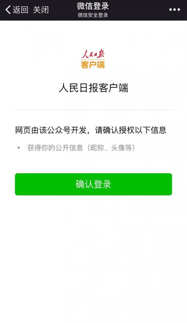 首先,我们可以观察到,在确认授权人民日报客户端的信息中主要包括个人昵称和头像等,这些信息似乎并非个人隐私信息。