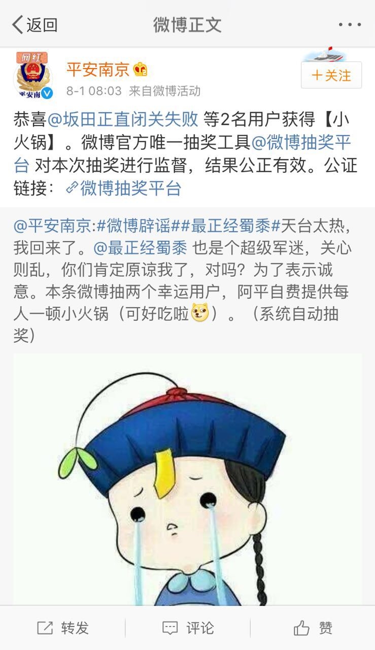 就在这则微博发出前,平安南京先一步发出转发抽奖的微博,奖品还是......一顿小火锅???