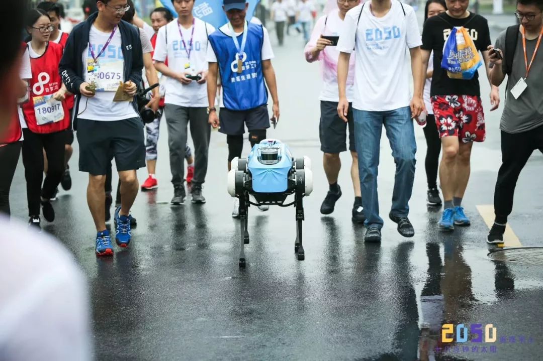 现场最热门的网红“绝影”四足机器狗,可实现快速行走和跑跳、爬楼梯、倒地起立等多种运动形式,面对复杂环境表现出很强的适应力,即使被踢上一脚也能快速恢复平衡。这只蠢萌的机器狗赚足了现场参观者的眼球,特别是以更好玩、更耐玩的特征赢得了众多小朋友的青睐!与此同时,在27日早晨的逐日晨跑项目里,“绝影”以英勇的护卫狗身份,和追逐七八点钟太阳的年青人们一起冲刺终点!