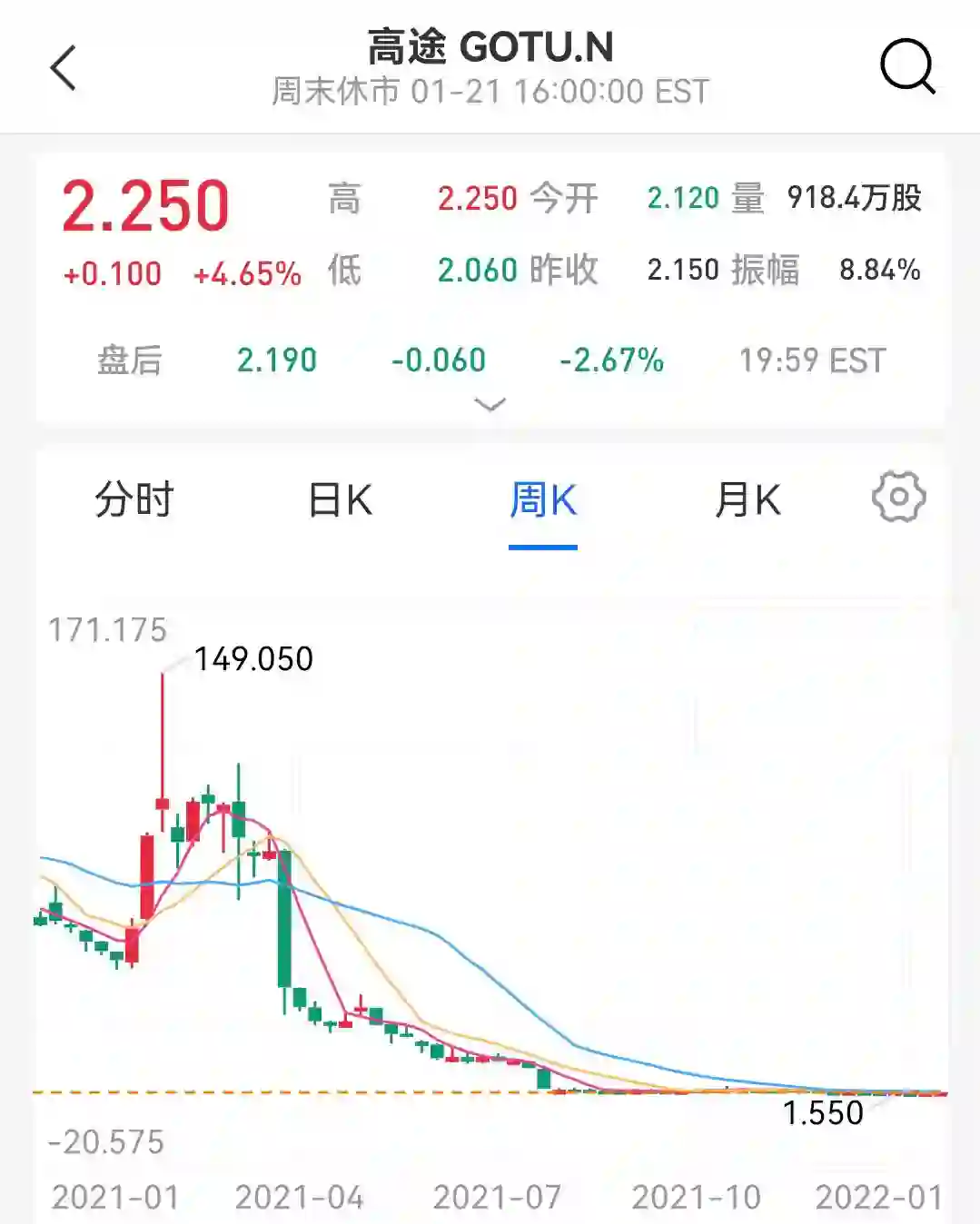 ▲高途教育2021最高股价149.05美元,如今2.25美元,跌幅超98%