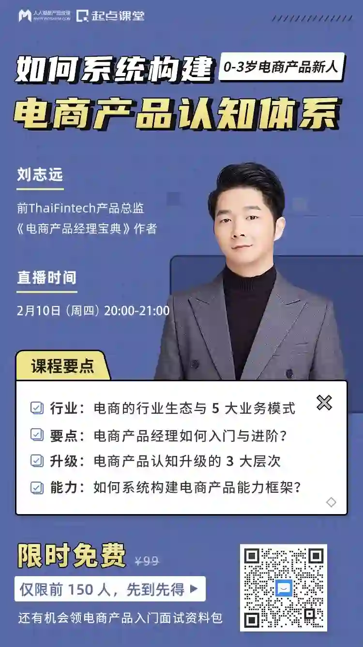 针对这些问题,为了帮助 0-3 岁电商产品经理更快入门与成长,2月10日(周四)晚8点,人人都是产品经理&起点课堂邀请前Thaifintech产品总监、畅销书《电商产品经理宝典》作者刘志远老师,准备了这次直播公开课。