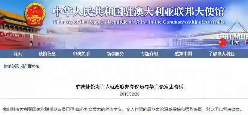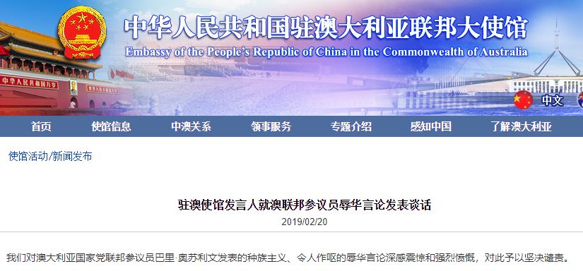 对于澳参议员的辱华言论,20日,中国驻澳大利亚使馆发言人发表谈话,