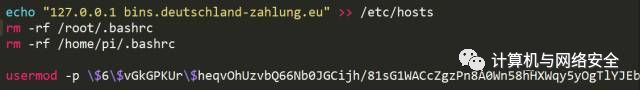 3、将一个可疑地址加入到/etc/hosts,将本地地址解析到bins.deutschland-zahlung.eu删除shell设置的环境变量,并且改掉pi用户的密码信息。