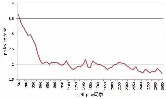 正常来讲,最开始的时候,我们的策略网络基本上是均匀的随机输出落子的概率,所以 entropy 会比较大。随着训练过程的慢慢推进,策略网络会慢慢学会在不同的局面下哪些位置应该有更大的落子概率,也就是说落子概率的分布不再均匀,会有比较强的偏向,这样 entropy 就会变小。