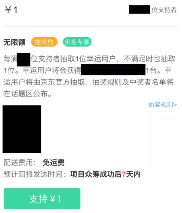 不过在一周以来的媒体曝光中还有一个很少被关注的地方,就是众筹项目的“一元档”。此类项目一般将金额设置为 1 元,抽奖用户数量正好满足售出 1 台机器的众筹价格时就会开奖一次,余数不满足时也会把剩下的人再集合起来开奖一次。京东众筹的不少项目都有这样的抽奖档位。
