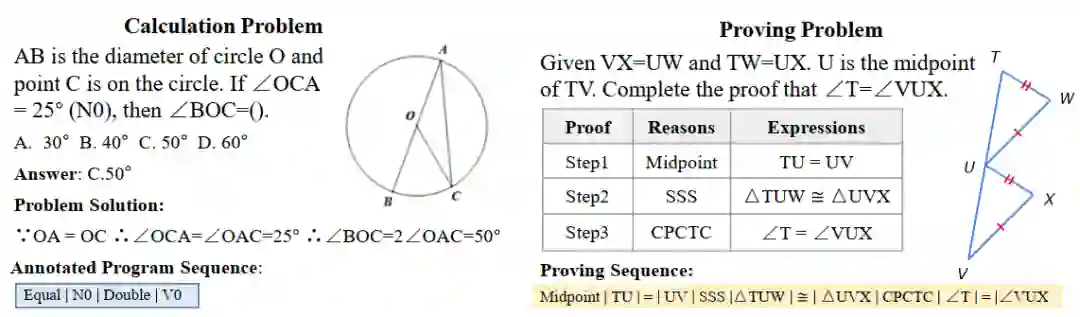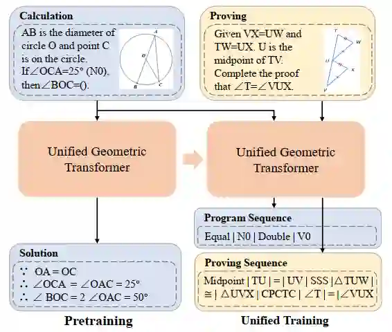 几何题自动求解是一个用于评估深度模型多模态推理能力的基准。然而,在大多数现有的工作中,几何计算题自动求解和几何题自动证明通过会被视作两个不同的任务,并施加不同的标注处理,妨碍了深度模型在不同数学任务进行统一推理的研究进展。从本质上来说,几何计算题和几何证明题目具有相似的问题表达和解题所需的数学知识也有所重叠。因此,通过对几何计算题自动求解和几何题自动两个任务进行统一表示和学习有助于提升深度模型对这两种问题的语义理解和符号推理。