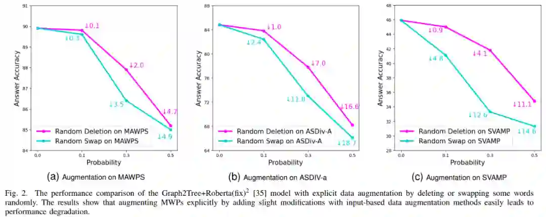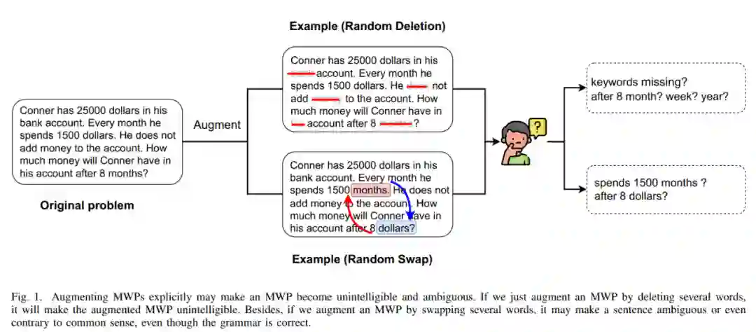 MWP 的数据瓶颈问题鼓舞我们思考如何使用成本高效的数据增强方法来改进数据利用效率,提升求解器的性能。最直接的数据增强方法就是基于输入的数据增强方法,如常用的字符替换,字符删除等,但是这类方法对于 MWP 来说是不适用的,因为 MWP 具有言简意赅的特点,对输入的文本的扰动或修改容易使得题意模糊。此外,题意所蕴含的数学关系是不能被改变的,但这类方法很可能会改变题意所蕴含的数学关系,如图 15 所示。