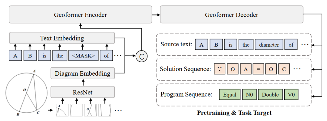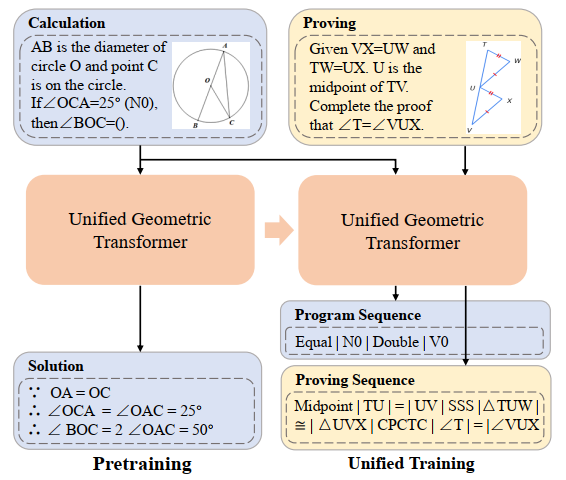 在利用形式化符号语言对几何计算题和几何证明题进行统一标注后,为了验证这两种题目的统一表示能有效地促进模型对几何计算题和几何证明题的语义理解和符号推理能力,从而实现更高效的计算题求解和证明题证明。中山大学人机物智能融合实验室团队构建了面向几何题求解和证明统一处理的 Geoformer 来同时处理几何计算题和几何证明题,如图 11 所示。
