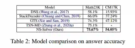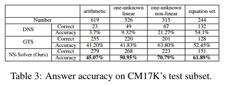 在实验中,文章将提出的 NS-Solver 与现有方法在 Math23K 和 CM17K 上进行了对比,并进行了消融实验,证明了 NS-Solver 良好的解题能力和通用性。其实验结果如下面两个表所示。