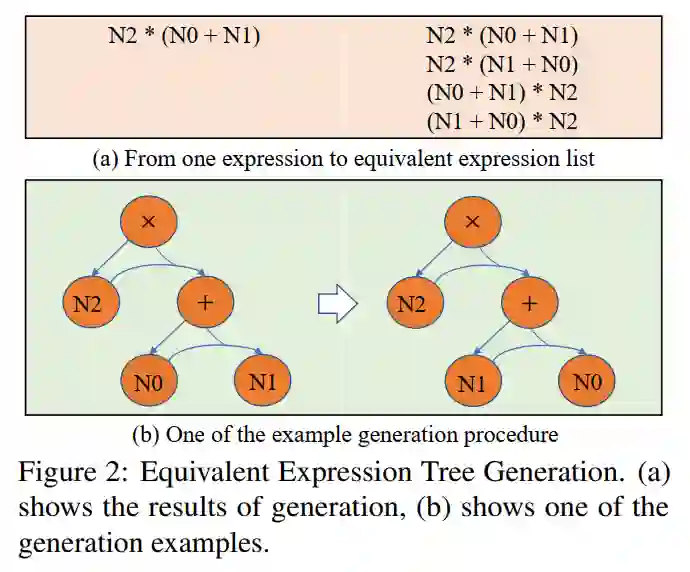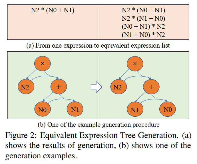 为了缓解学习偏置(learning bias),我们提出动态目标选择策略,在训练过程中根据模型输出的结果来选择与其更加接近的目标表达式来作为 GroundTruth。为了获得等价的表达式,我们利用数学运算中的交换律来对表达式树进行变形,从而获得多个等价的表达式。如图 7 所示。