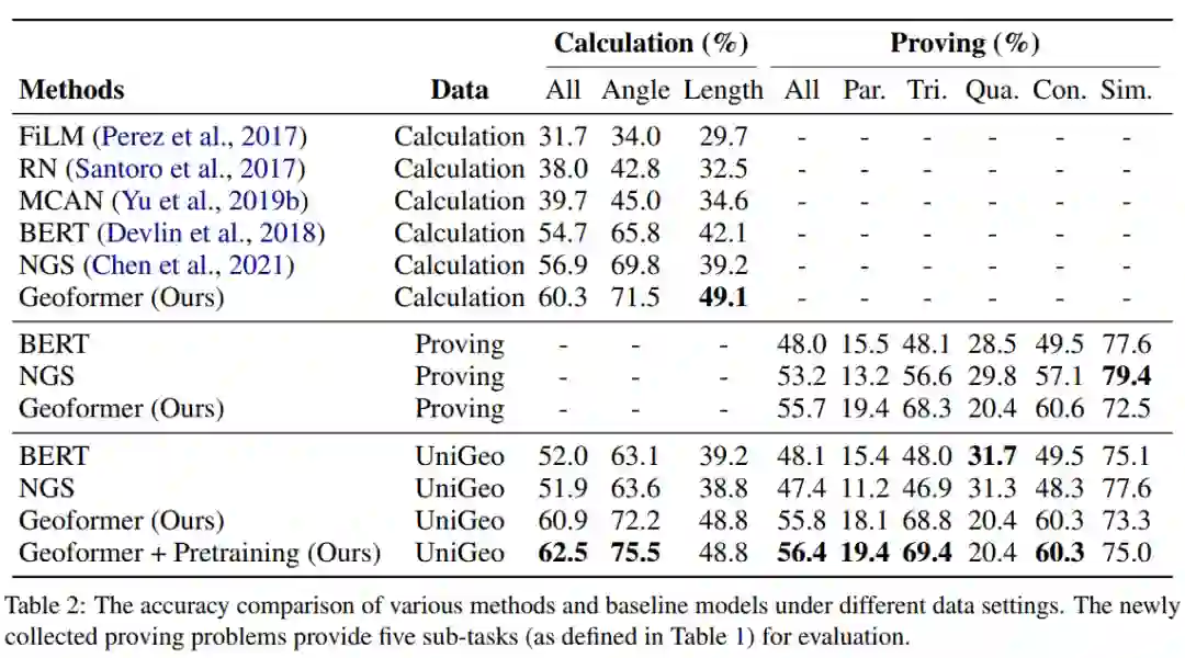 在实验中,我们在 UniGeo 基准的基础上构建多个基线模型,并对我们提出的 GeoFormer 进行性能对比。实验结果如下表所示。
