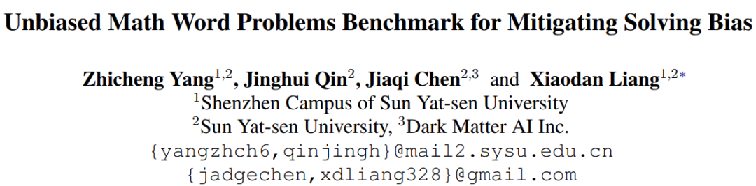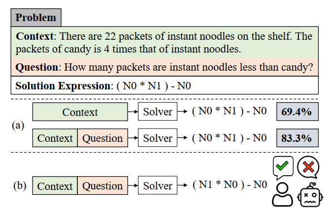 在这个工作中,中山大学人机物智能融合实验室团队重新审视在当前的数学应用题求解基准上评估模型的解题偏置(solving bias)。这种解题偏置主要数据偏置(data bias)和学习偏置(learning bias)引起。数据偏置(data bias)是指训练数据集未能涵盖每个问题的所有不同叙述方式而导致的解题模型只能学习到浅层语义,未能对题意进行深度语义理解的问题,如图 6(a)所示,由于解题模型只学习到浅层语义,并以此来进行解题, 那么即使我们把题目中的问题部分移除后,解题器仍然能达到 69.4%。