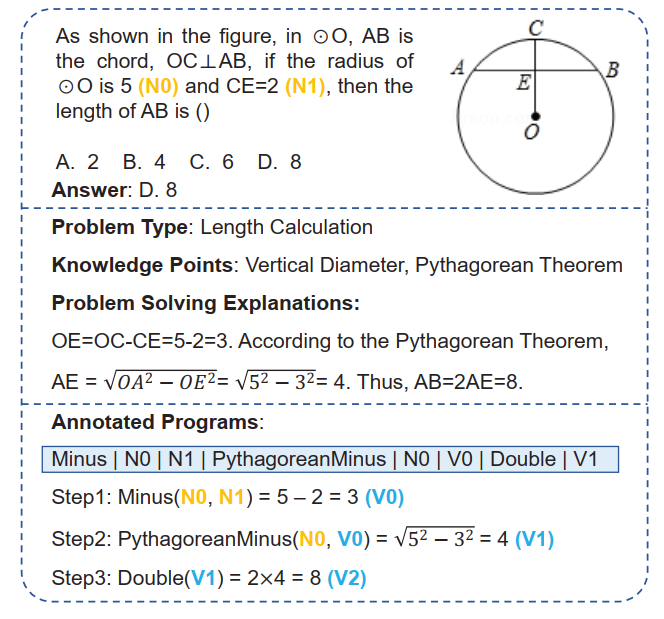 为此,中山大学人机物智能融合实验室团队构建了一个包含了数千道几何题的基准数据集 UniGeo。UniGeo 包括了 4,998 道几何计算题和 9,543 个几何证明题。我们对每个证明题均进行了多步骤证明标注,且这些标注可以很轻易地被转换为可执行的符号程序。而计算题也采用类似的标注,如图 10 所示。经过采用如图 10 所示的方式进行标注后,UniGeo 能很好地以形式化符号语言将几何计算题和几何证明题进行统一的表示。