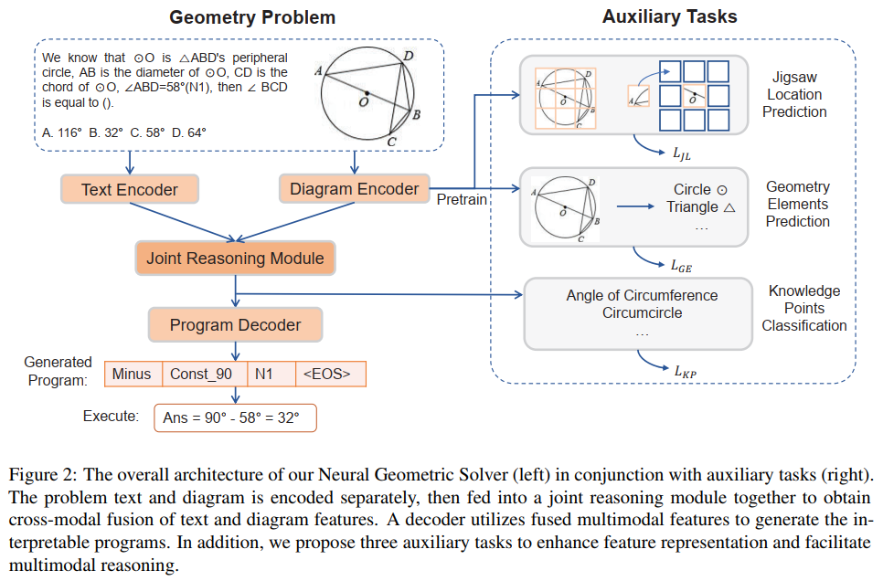 此外,为了增强几何图形编码器对几何图形的表征能力以及推进联合推理模块对题目所包含的多模态信息进行充分融合和高效表达,我们还引入了多种辅助任务来改善模型的表征能力和注入定理知识。这些辅助任务包括:1)拼图位置预测:通过把几何图形切割为多个 patch,并随机排列,然后让几何图形编码器对其重新排列,实现对几何图形的像素级图形理解;2)几何元素预测:让几何图形编码器学习预测哪些几何元素出现在了当前的几何图形中,实现对象级图形理解;3)知识点预测:在联合推理模块进行题目文本表征和几何图形表征的多模态融合的同时引入知识点分类任务来改进整体的问题表征。在 NGS 中,我们利用拼图位置预测和几何元素预测对几何图形编码器进行预训练。而知识点预测任务则作为一个子任务和 NGS 进行多任务训练。