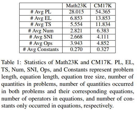 此外,为了更好地验证求解器的性能,我们还构建了一个更大规模的多题型数学应用题数据集 CM17K,从而更好地推动数学解题社区的研究。CM17K 包含了 6215 道四则运算类应用题,5193 道一元一次方程类应用题,3129 道一元非线性方程类应用题和 2498 道方程组类应用题。CM17K 和 Math23K 的数据统计如下表所示。从数据统计上可以看出,CM17K 相比 Math23K 具有更长的题目信息,更长的求解表达式,涉及更多的常识等,这意味着 CM17K 在求解难度上更好地刻画解题器的性能。