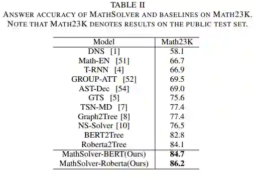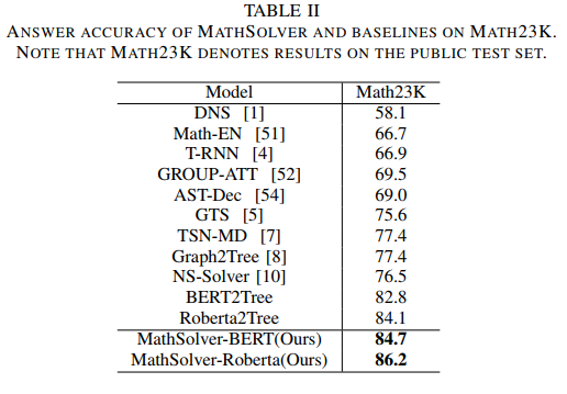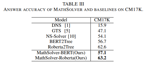 在实验中,我们使用不同的预训练语言模型作为初始化并验证我们方法的效果。我们分别使用 BERT-base 和 Roberta-base 权重对问题编码器 MathEncoder 进行初始化,并使用 GTS 中的 decoder 作为表达式解码器。我们统称基于 MathEncoder 的求解器为 MathSolver。我们将 MathSolver 与多个方法在 Math23K 和 CM17K 上进行了对比。实验结果如下表所示。