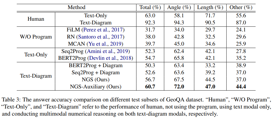 从上表可以看到,NGS 相比基线模型在 GeoQA 上能达到更好的解题性能。但是我们也可以看到各类模型与人类在几何题求解上仍然存在较大的差距。