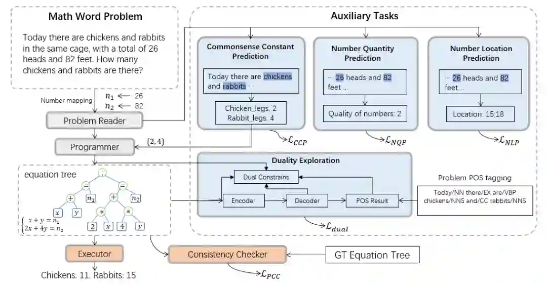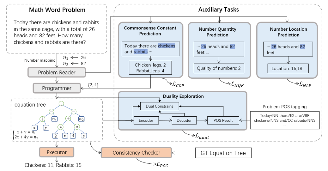 在符号约束上,我们提出多种辅助任务来利用额外的训练信号和利用常识预测结果来显式地约束符号表,降低问题求解搜索空间:1)自监督的数字预测任务:通过预测题目中数字的位置和数量来更好地理解题目语义;2)常识量词预测任务:注入常识知识并利用预测结果约束符号表,降低搜索空间;3)一致性检查:从语义层面检查解题器的输出与目标表达式的一致性;4)对偶利用任务:通过问题到表达式和表达式到问题的双向约束,强化解题器的问题语义理解。