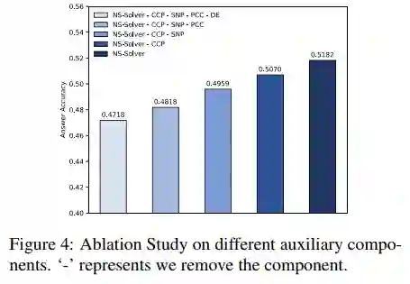 此外,我们还对辅助任务进行了消融实验,如下图所示。实验结果证明了各个辅助任务均能提升 NS-Solver 的解题能力。