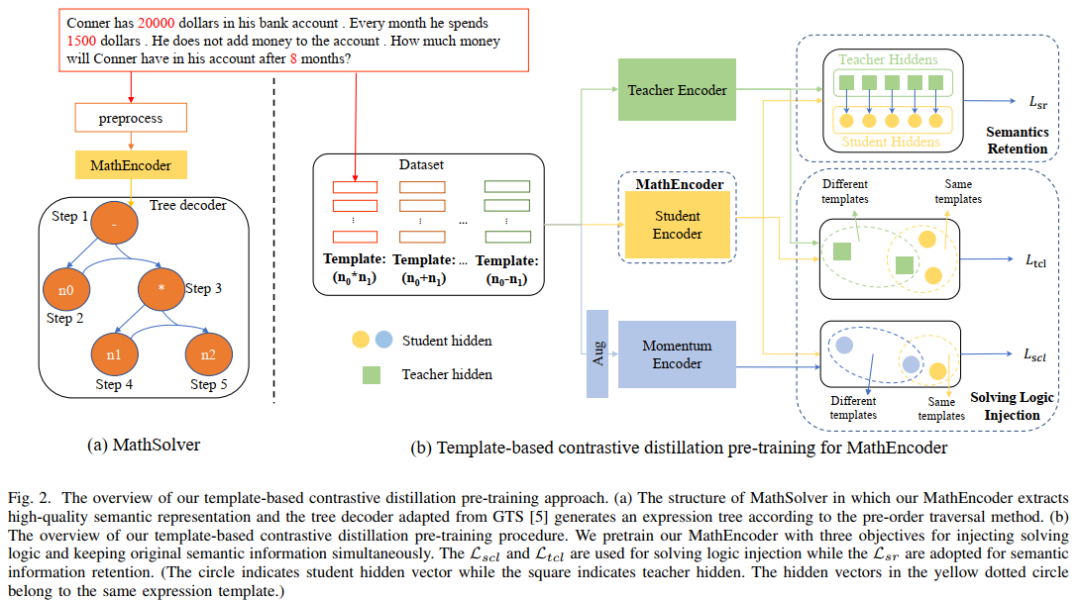 为了充分利用预训练语言模型所包含的丰富知识以及利用求解逻辑来更高效地求解应用题,中山大学人机物智能融合实验室团队提出基于解法模板和预训练语言模型的对比蒸馏预训练方法对求解器中的问题编码器进行领域预训练,如图 14 所示。该方法使用多视角对比学习有效地考虑数学逻辑知识的同时利用知识蒸馏的方式有效地保留了预训练语言模型中的知识和高质量语义表示能力。