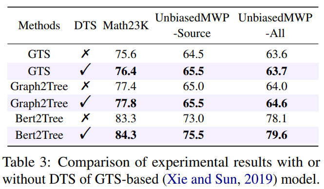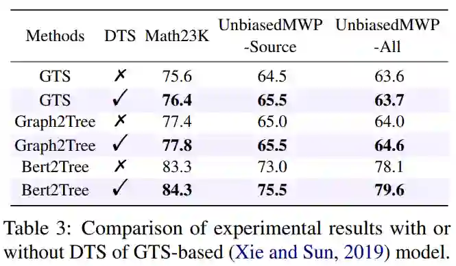为了验证我们的动态目标选择策略是否能降低学习偏置,我们将动态目标选择策略应用在多个解题模型上。实验结果如下表所示。