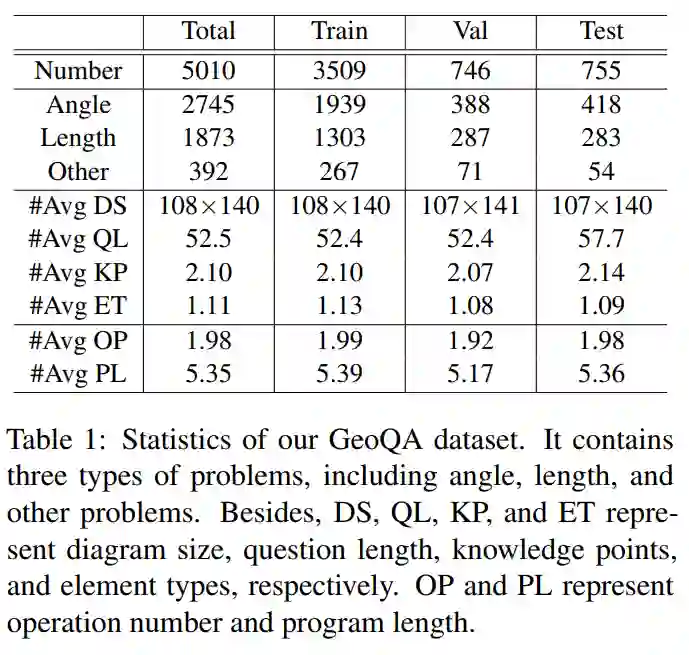 为了推动几何题自动求解的研究,中山大学人机物智能融合实验室团队构建了一个由 5010 道几何选择题组成的问答数据集 GeoQA。如图 4 所示,GeoQA 数据集中的每一个样本具有题目描述、几何图像、问题选项、答案、问题类型、知识点、解答解析,以及按解题步骤标注的形式程序。在题目规模上,该数据集是前人工作常用的 GeoS 数据集的 25 倍。GeoQA 数据集的相关统计信息如下表所示。
