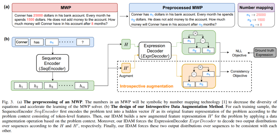 为此,我们提出了一种适用于 MWP 数据的简单高效的数据增强方法 - 自省式数据增强方法(IDAM),在训练过程种对题目在隐空间的表示进行增强,从而解决了基于输入的数据增强方法在 MWP 求解任务上所遇到的问题。IDAM 方法通过对问题的表示编码执行不同的表示构建方法(均值池化、层次化聚合,随机丢弃,随机交换等),得到一个新的问题表示,然后使用一致性目标函数(基于表达式之间的 JS 散度)来约束求解器基于新问题表示的表达式解码输出要和基于原问题表示的表达式解码输出具有一致性。该方法的示意图如图 17 所示。
