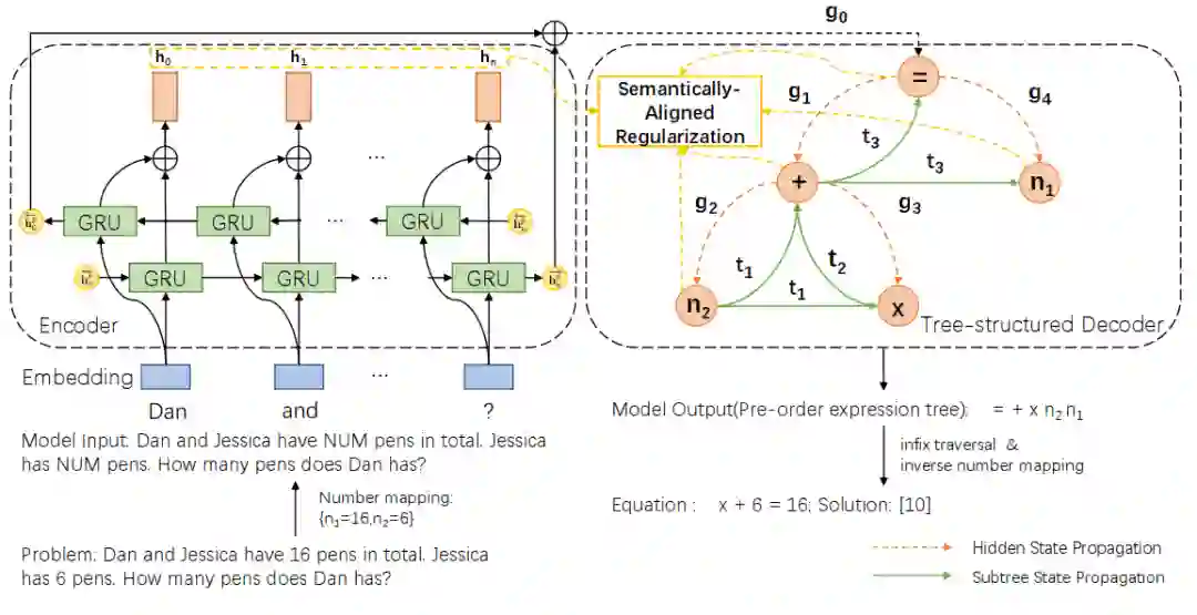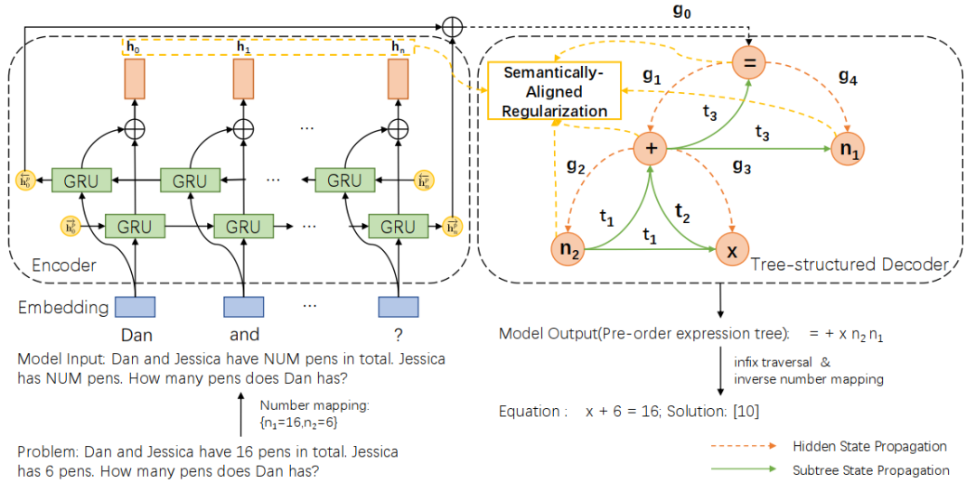基于统一表达式树表示方案,我们进而提出了一种语义对齐的树结构通用求解器(SAU-Solver),如图 2 所示。我们的树结构通用求解器由两部分组成,基于双层 GRU 的问题编码器和基于统一表达式树表示的树结构解码器。并且在训练过程中,我们引入了语义对齐正则化,通过约束表达式子树与题目上下文的一致性使得我们的通用求解器能更充分地考虑问题和表达式之间的语义关系,发掘各类数学知识,从而提升求解器的表达式生成能力。