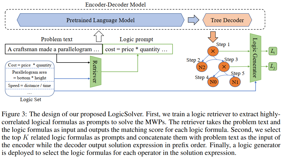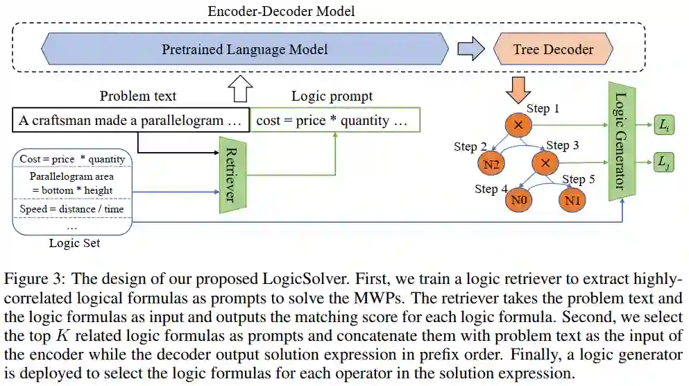 LogicSolver 主要由逻辑知识检索组件、逻辑提示增强 MWP 求解器和解释生成组件三大组件构成。逻辑知识检索组件。对于每一道 MWP,我们从 210 种逻辑公式检索 top-k 个高度相关的逻辑公式作为提示,以增强 MWP 的求解。我们将逻辑公式提示与问题文本连接起来作为输入,驱动 MWP 模型生成求解表达式。最后,为了获取基于逻辑公式的解释,我们部署一个逻辑生成器来预测逻辑表达式树的每个内部节点(即运算符)所对应的逻辑公式作为求解的解释。