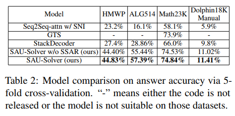 在实验中,文章将提出的 SAU-Solver 与现有方法在 HMWP、Math23K、ALG514 和 Dolphin18K-Manual 进行了对比。实验结果如下图所示,证明了我们方法的通用性和更好的数学解题能力。