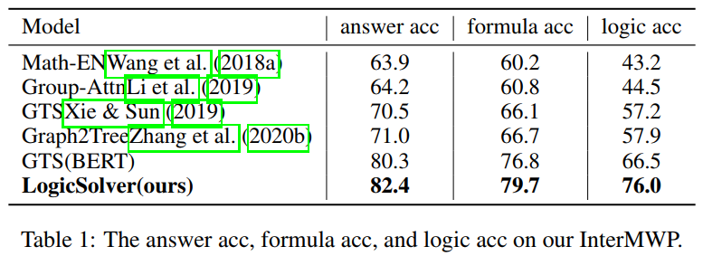 在实验中,我们在 InterMWP 数据集上构建了多个基线模型,并将我们的 LogicSolver 与这些基线模型进行对比。其实验结果如下表所示。