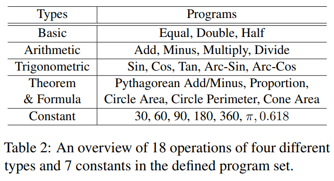 而 GeoQA 数据集所使用的形式程序算子和所涉及的常量如下表所示。