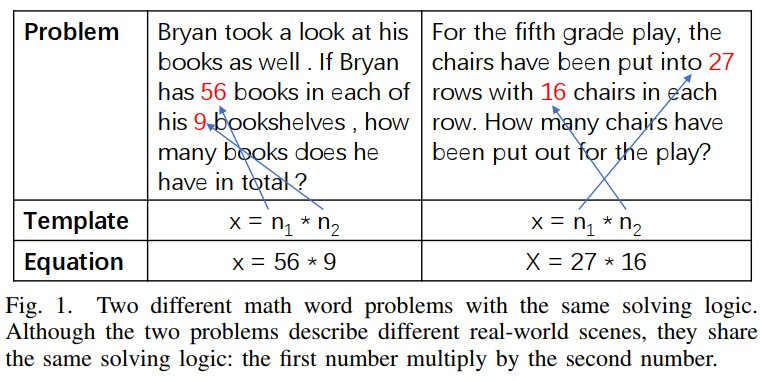 虽然深度学习模型在数学解题领域取得很好的进展,但是这些模型忽视了蕴涵在问题描述中的求解逻辑,而这种解题逻辑往往可以和解题模板(解法)相对应。如图 13 所示,两个不同的应用题均可以对应相同的解法。