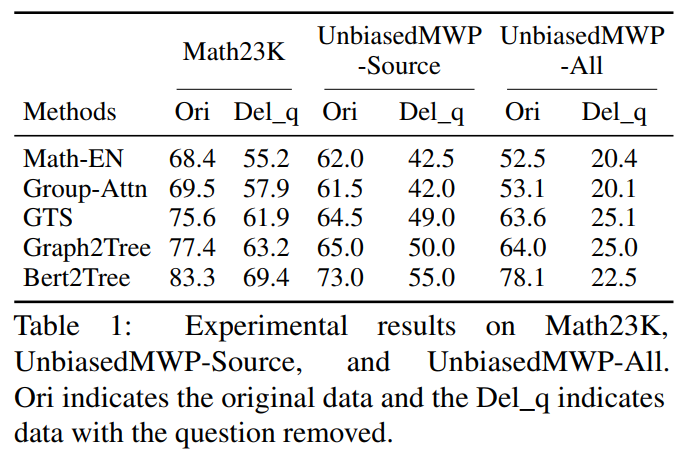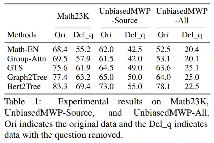 从实验结果可以看到,相比于现存的 Math23K,我们的数据集 UnbiasedMWP 所存在的数据偏置更少,因为当我们移除了题目问题后,模型的求解性能急剧下降,从侧面证明了我们的数据集更加能使得模型需要关注深层语义信息才能进行求解。
